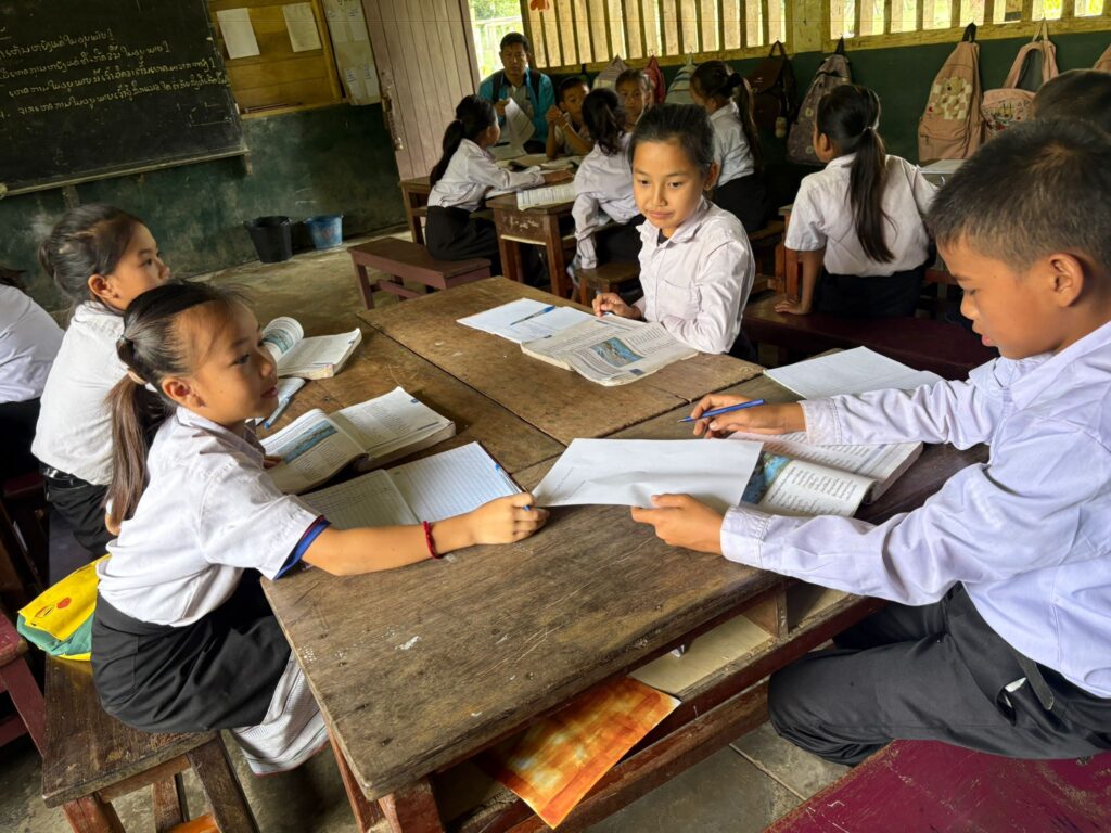 少数民族児童がラオス語の授業でグループワークをしている様子