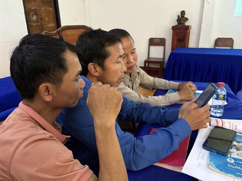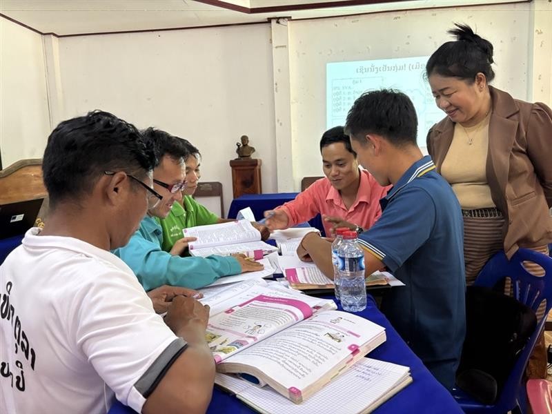 教科書とラオス語教科のハンドブックの学習会を模擬体験している様子