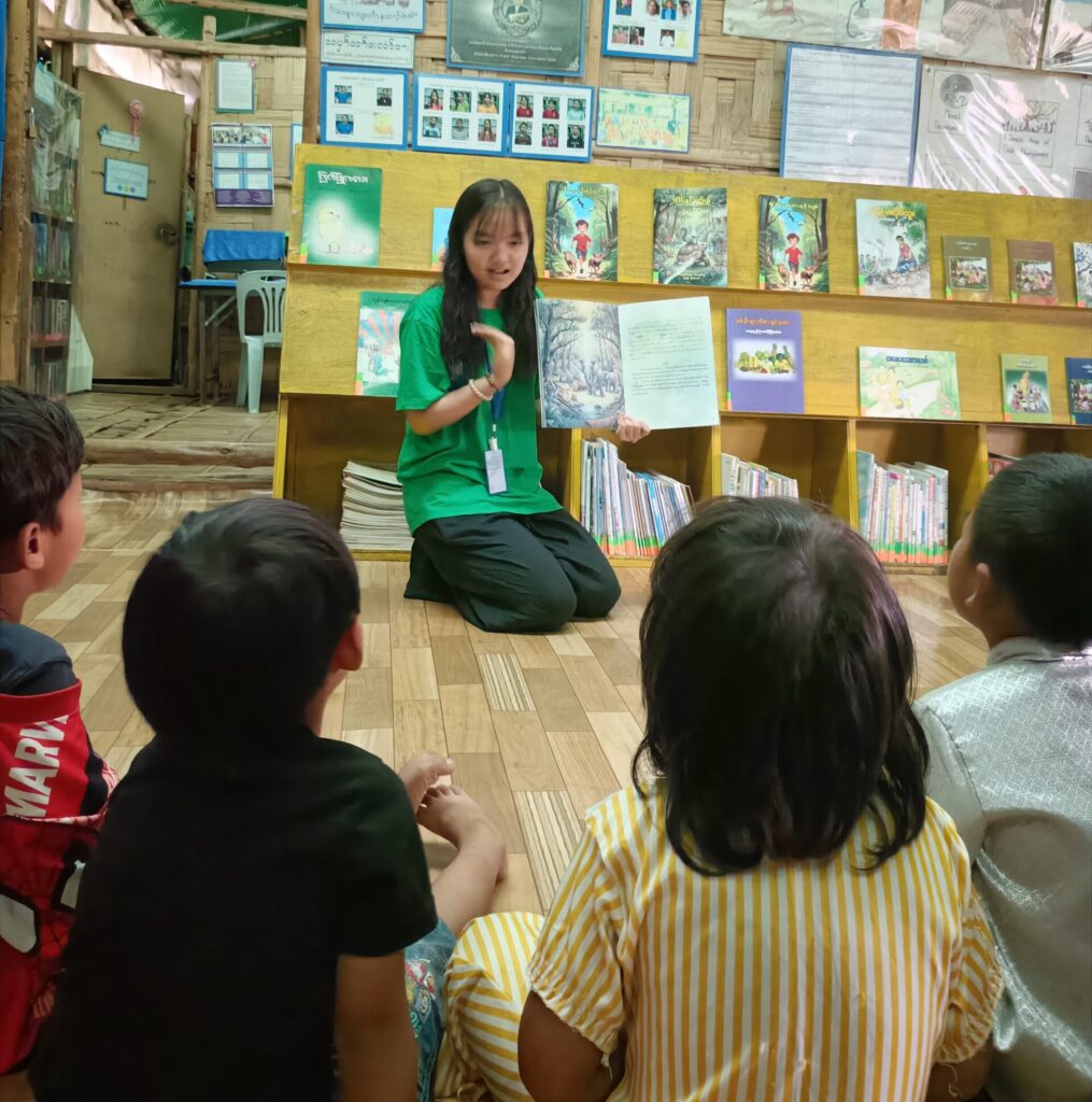 キャンプ内のコミュニティ図書館では、図書館青年ボランティアが子どもたちに読み聞かせをしているところを見学しました。体を動かすアクティビティを行った後、動物がたくさん登場する本を取り出します。小さな子どもたちが飽きないように、動物の名前を問いかけたり声色を使い分けたりと工夫しながら読み聞かせをしていました。図書館は停電中でしたが、子どもたちがわっと盛り上がると周りが明るくなるようでした。このボランティアは高校3年生の女の子で、この図書館で4年間読み聞かせを行ってきた大ベテランです。図書館を訪れる子どもと遊ぶのが好きで、将来は学校の先生になりたいと話してくれました。話の途中、突然大粒の雨が降ってきて、乾季だというのに土砂降りになりました。トタン屋根は、雨漏りはしにくいものの、雨が降ると隣の人の声も聞こえないほどの騒音になります。ウンピアム難民キャンプは深い山の中にあるので昼間でも涼しく、天気も変わりやすいそうです。