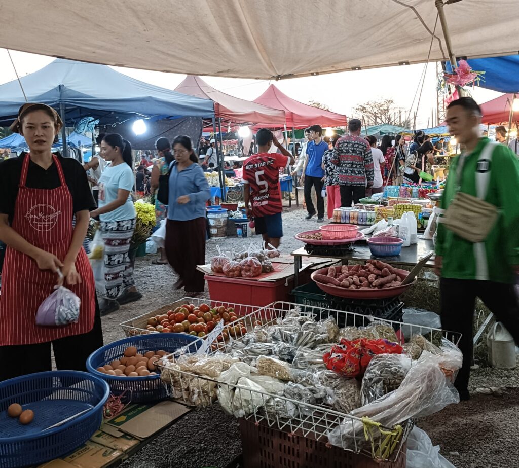タイとミャンマーの国境沿いには難民キャンプが9つありますが、その内3つがターク県内にあります。町にはタイの文化の他に、ミャンマーやカレン、ムスリム、中国系などの文化が混ざり合っている様子を感じます。カレン族の布の肩掛けバッグを持っている人や、伝統衣装を着ている人、木をすりつぶして作る日焼け止め「タナカ」を顔に塗っている人に出会いました。使われる言語も様々で、レストランのメニューにはタイ語とビルマ語が併記してあり、よく聞いているとカレン語の挨拶も聞こえてきます。活動中はタイ料理だけでなく、ミャンマー料理やカレン料理を食べる機会もありました。事務所の職員さんにもカレンの方がいて、業務中はタイ語・カレン語・英語が飛び交っています。