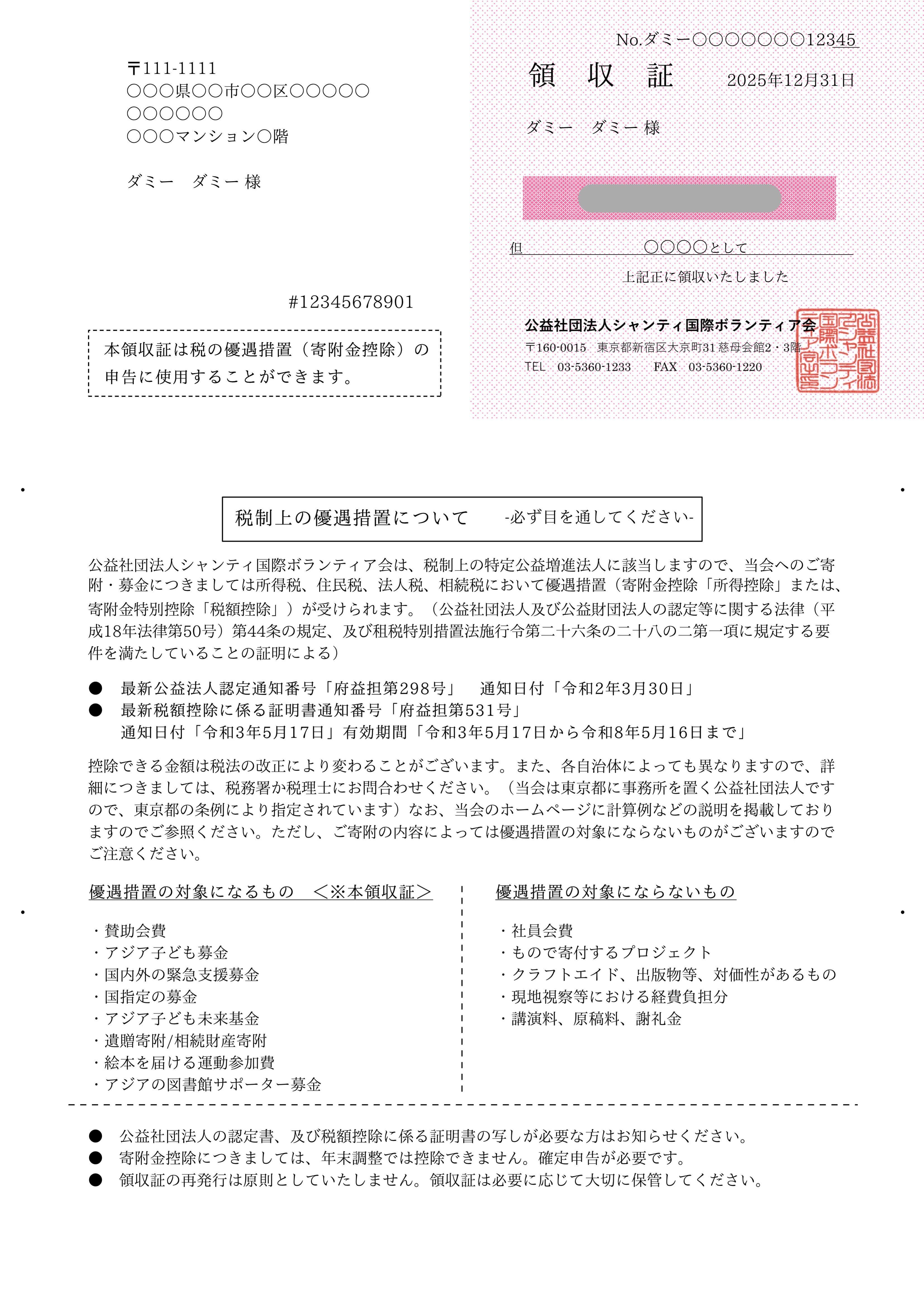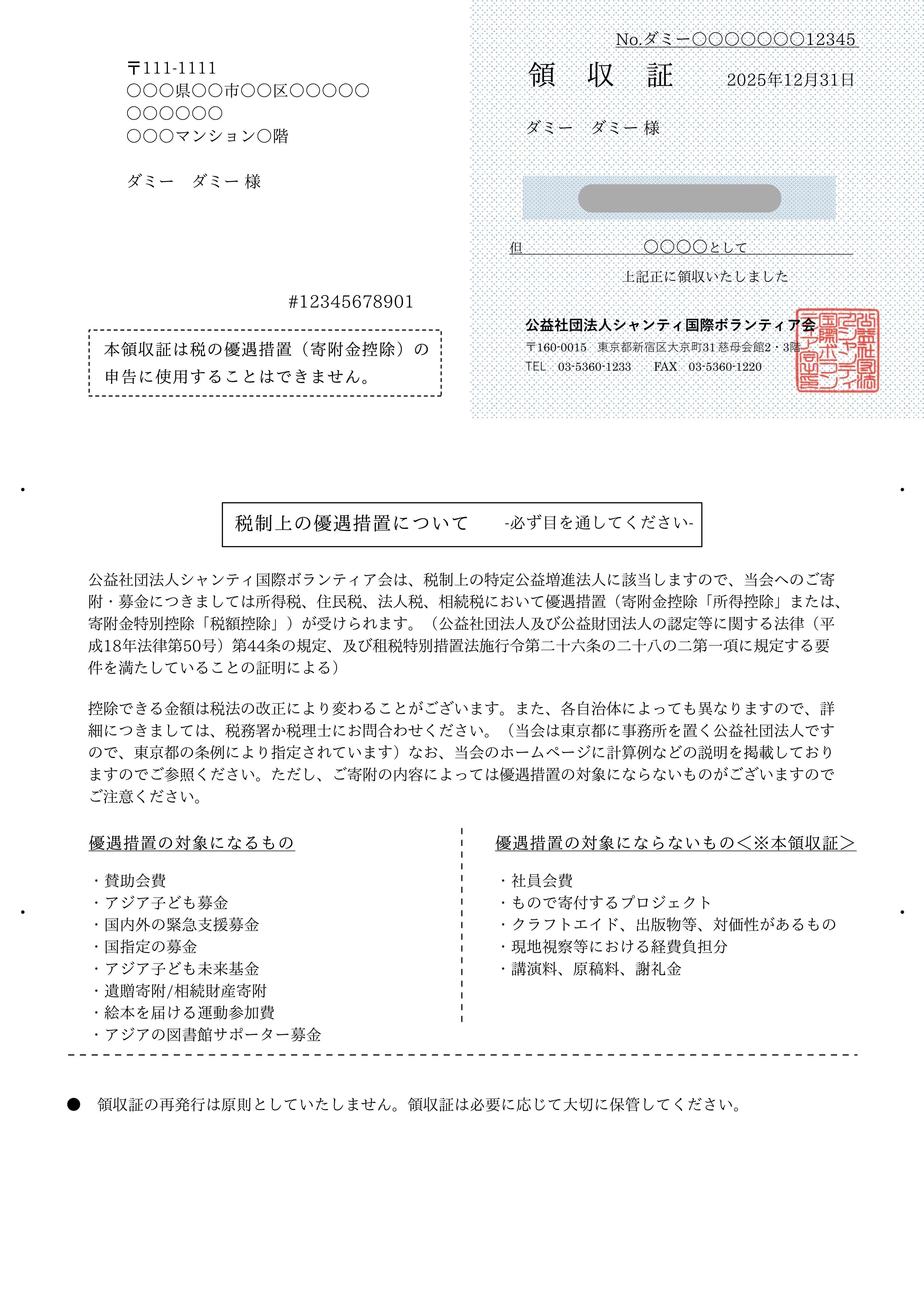 ・会費、アジアの図書館サポーターの入金に対する領収証が必要な場合は、1月末に前年分をまとめて送付させていただきます。※特定公益増進法人であるシャンティ国際ボランティア会へのご寄付は、お申し出により税制上の優遇措置(寄付金控除)が受けられます。 寄附金控除をご希望の方には、領収証と必要な書類をお送りいたします。ただし、12月にお申し込みされたご寄付に関しては入金が1月以降となる為、次の年の控除対象となりますのでご注意下さい。