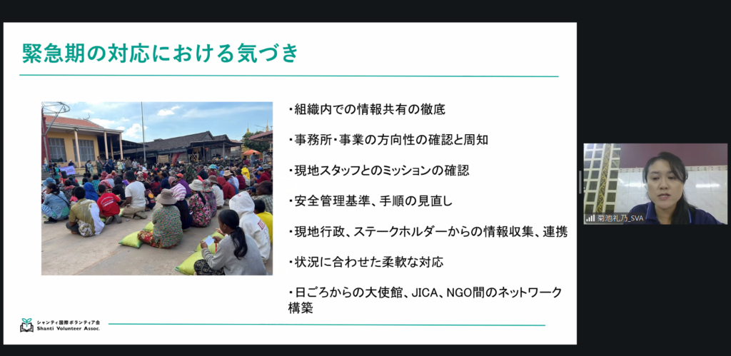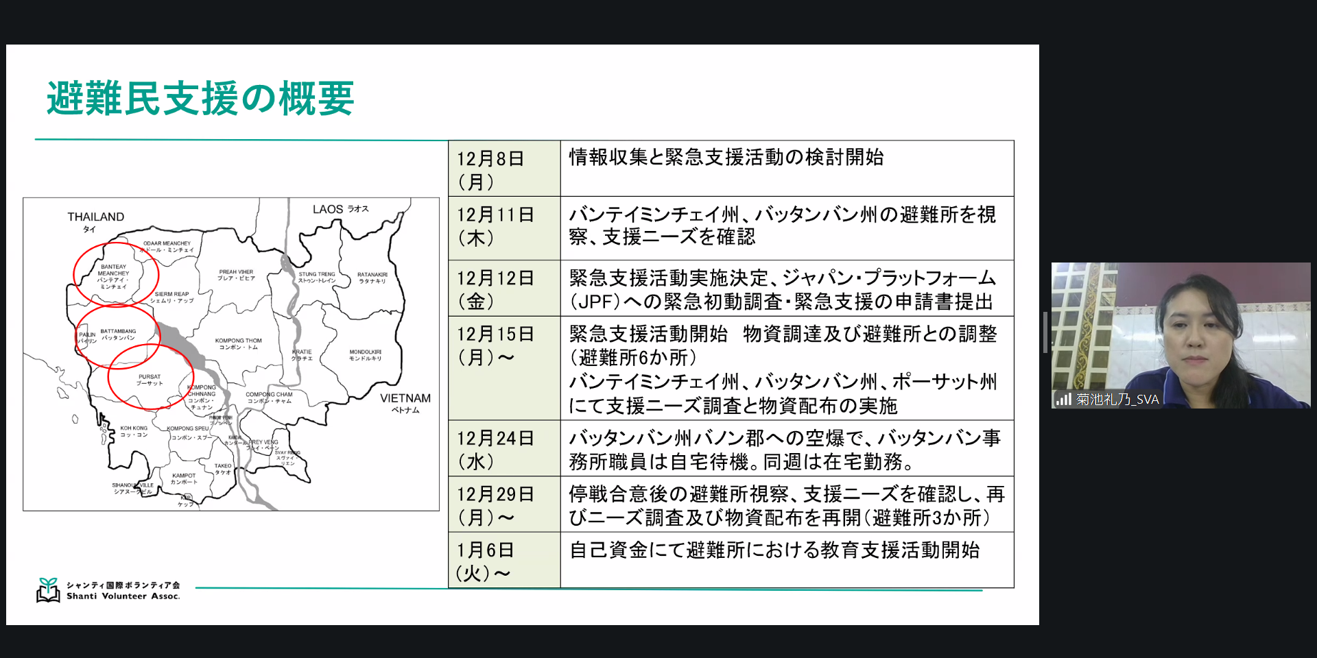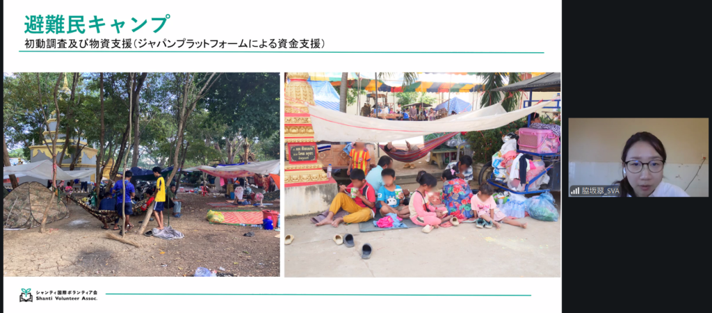 続いてカンボジアのバッタンバン事務所の脇坂調整員より、実際に避難所や避難している人びとの様子について報告が行われました。