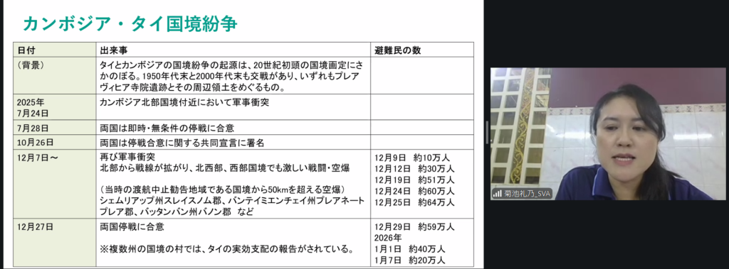 本紛争の起源は20世紀初頭の国境線策定にあり、過去にも断続的に衝突が発生してきた経緯があるとのことでした。2025年5月末から小規模な衝突が再燃し、7月には大規模な軍事衝突へと発展し、当時カンボジア側では約30万人の避難民が発生したことが報告されました。その後、一時的に停戦したものの小規模な衝突は継続しましたが、10月に停戦合意が締結されました。