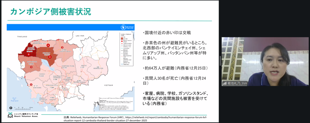 報告会では、最初にカンボジア事務所長の菊池より、カンボジアとタイの国境紛争のこれまでの経緯と現状について説明が行われました。冒頭では、カンボジアの基礎情報やシャンティのカンボジアでの活動の歴史が共有され、その上で紛争について解説がありました。