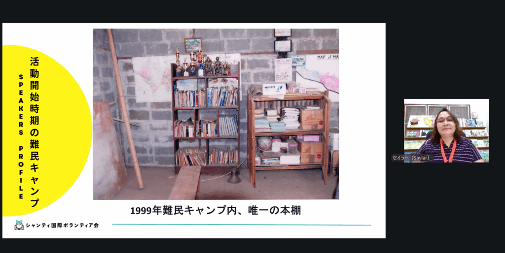 セイラー職員が難民キャンプに関わり始めたのは24年前のことです。シャンティに入職する前は、難民キャンプの学校でボランティアの教師として活動していました。当時は図書館も絵本もなく、また子どもたちはトラウマを抱え、勉強に集中することが難しい環境でした。子供たちは本や夜に勉強をするためのロウソクさえ買うお金がなく、将来を思い描くことすら困難でした。この経験からキャンプの状況を改善するために、教育だけでなく、心を癒す場の必要性を痛感したセイラー職員は、シャンティと出会い、2001年に入職しました。以来図書館活動をキャンプに広げてきました。