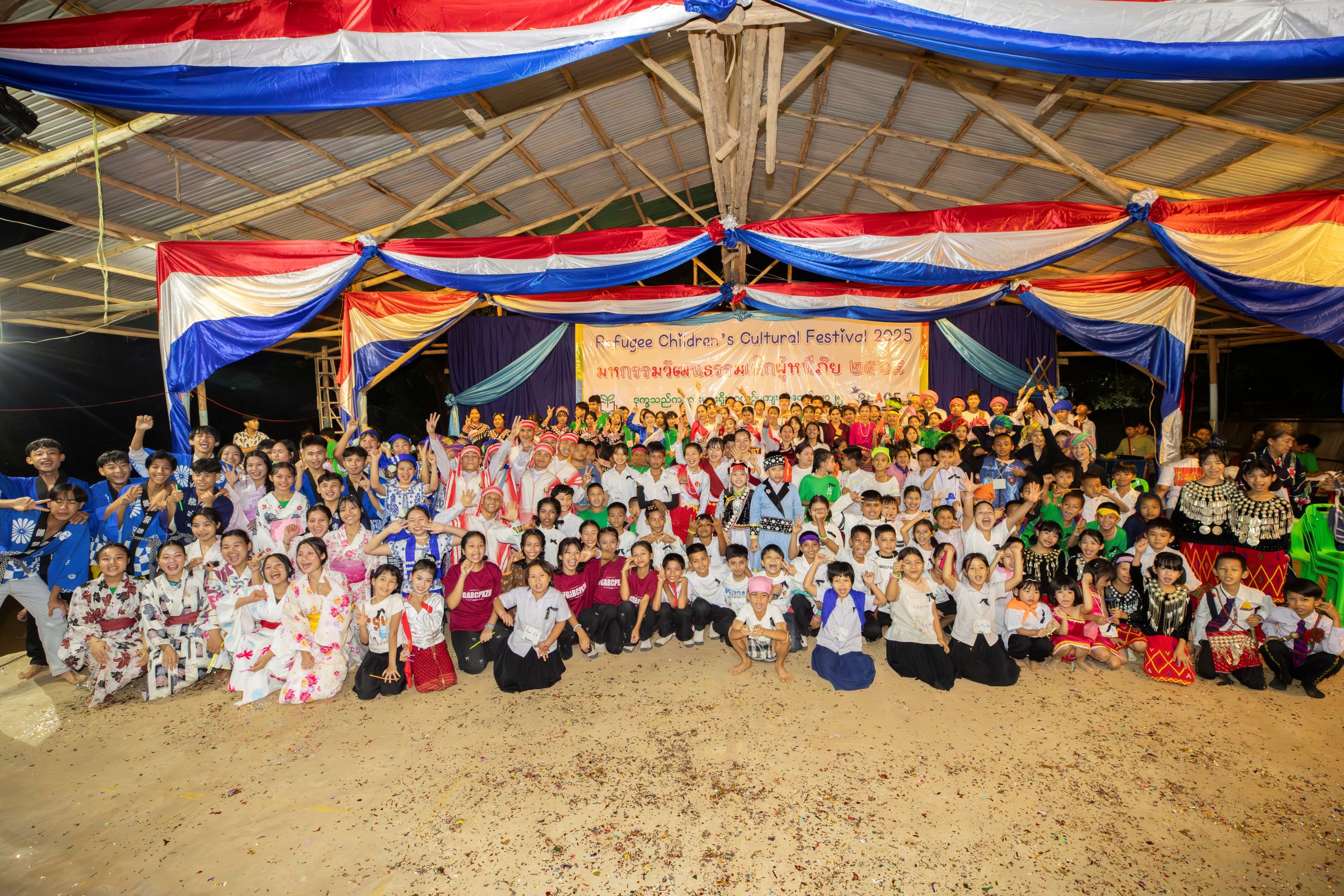 シャンティでは、姉妹団体のシーカー・アジア財団から始まった文化祭を長年複数国の子どもたちを招いて開催してきた経緯があります。故八木澤氏が常に語っていた目標は、参加した全員が最後は感動できるようなステージにすることでした。しかし、この感動するステージを経験したことがない職員にとっては、フィナーレをどう飾るかは難題でした。何度も協議を重ね、フィナーレはどの民族にも偏らない曲を選曲し、平和を願って“We are the world”をビルマ語で歌うこと、そして、文化祭や図書館に継続支援をしてもらっている日本の方々ともつながれる曲として選んだのは「未来へ」でした。最初に「未来へ」の歌詞を海外職員に伝えた時に、涙を浮かべる人もいました。未来が絶たれた難民キャンプで「未来へ」を歌う、未来をあきらめてほしくないという思いを込めての選曲でした。子どもたちに向けて職員が歌うということから始まりましたが、2025年11月、久しぶりに開催された難民子ども文化祭で、子どもたちがこの歌を元気に合唱しているのを見て、胸がいっぱいになりました。