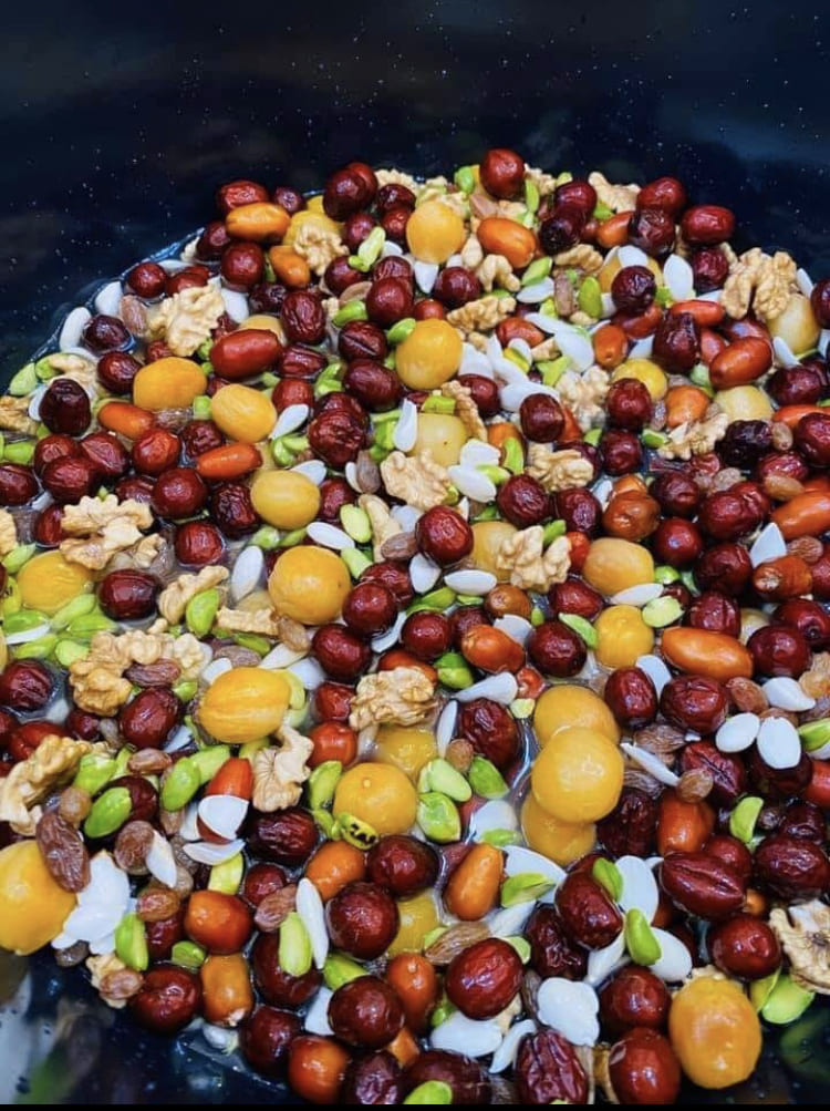 ↑ハフミワ:ナウローズによく食べられるお菓子で、レーズンやピスタチオ、くるみ、オリーブなどの7種類のドライフルーツを柔らかくなるまで煮たもの。朝食や間食として、アフガニスタンの人々がよく食べます。