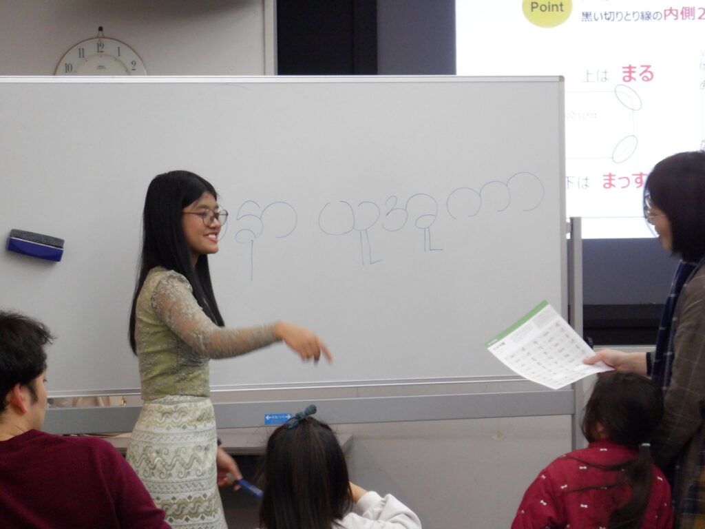 翻訳絵本をつくり終えた後は、ホワイトボードを使って、ビルマ語の書き方について、実際に参加者のお名前を書きながら説明をしました。