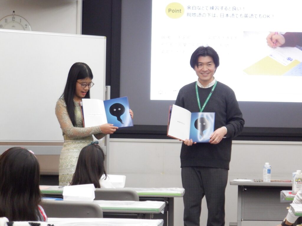 翻訳絵本をつくり始める前に、ミャンマー留学生ボランティアと職員によるビルマ語での絵本の読み聞かせを行いました。職員が日本語を朗読し、続いてミャンマー留学生がビルマ語で朗読します。カエルの鳴き声がでてくるところでは、日本語では「ケロケロ」、ビルマ語では「オウン グワン」と異なり、響きをお楽しみいただきました。