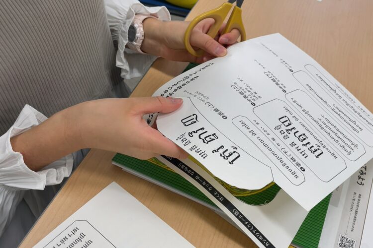 ワークショップでは、カンボジア、ラオス、ミャンマー、タイの難民キャンプの子どもたちに届けるために、クメール語、ラオス語、ビルマ語、カレン語の55冊の翻訳絵本を1人の方に2冊ずつ作成いただきました。