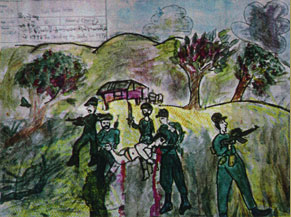 難民の小学生が描いた絵です。機関銃を構えた兵士に